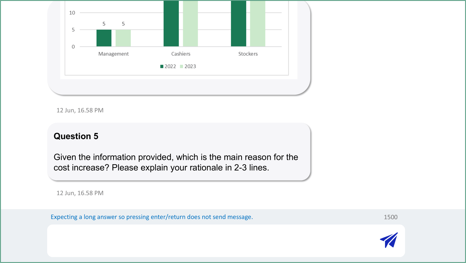 A different interface, the inability to clarify, the ticking timer at the top – all factors that will make casing with a chatbot disorientating for candidates.